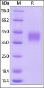 This protein carries a polyhistidine tag at the C-terminus. The protein has a calculated MW of 23.8 kDa. The protein migrates as 35-43 kDa when calibrated against Star Ribbon Pre-stained Protein Marker under reducing (R) condition (SDS-PAGE) due to glycosylation.