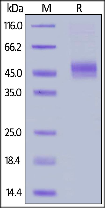 This protein carries a polyhistidine tag at the C-terminus, followed by an Avi tag (Avitag™). The protein has a calculated MW of 34.8 kDa. The protein migrates as 40-50 kDa under reducing (R) condition (SDS-PAGE) due to glycosylation.