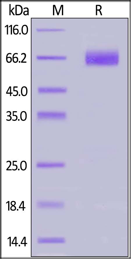 This protein carries a human IgG1 Fc tag at the C-terminus. The protein has a calculated MW of 47.3 kDa. The protein migrates as 60-75 kDa when calibrated against Star Ribbon Pre-stained Protein Marker under reducing (R) condition (SDS-PAGE) due to glycosylation.