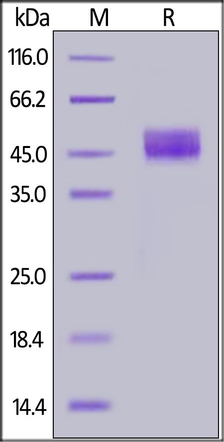 This protein carries a polyhistidine tag at the C-terminus. The protein has a calculated MW of 31.8 kDa. The protein migrates as 45-60 kDa when calibrated against Star Ribbon Pre-stained Protein Marker under reducing (R) condition (SDS-PAGE) due to glycosylation.