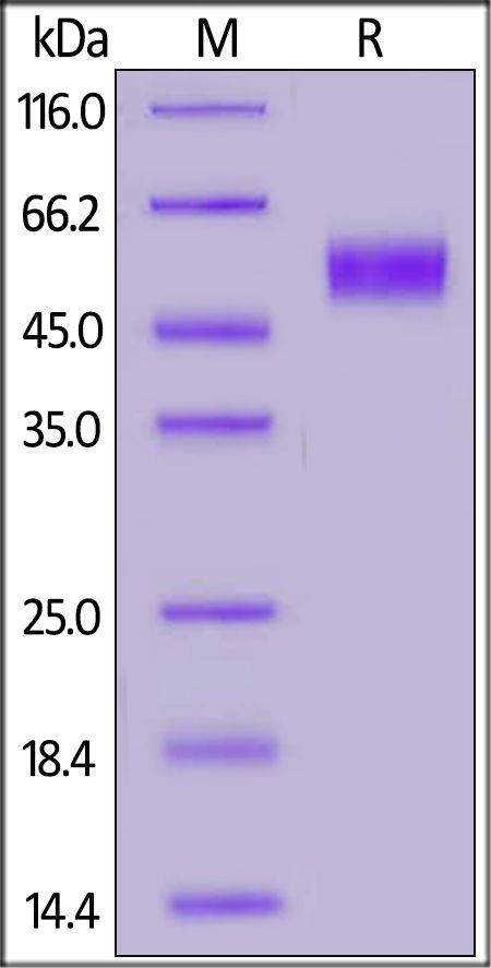 This protein carries a polyhistidine tag at the C-terminus, followed by an Avi tag (Avitag™). The protein has a calculated MW of 34.2 kDa. The protein migrates as 50-60 kDa under reducing (R) condition (SDS-PAGE) due to glycosylation.