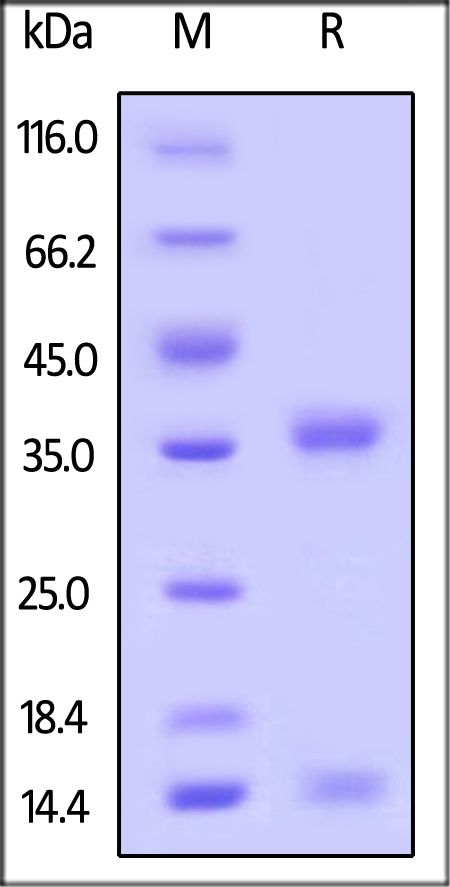 Cynomolgus / Rhesus macaque FCGRT&B2M Heterodimer Protein, His Tag&Streptavidin II Tag, produced by co-expression of FCGRT and B2M, has a calculated MW of 32.3 kDa (FCGRT) and 13.1 kDa (B2M). Subunit FCGRT is fused with a polyhistidine tag at the C-terminus and subunit Beta-2 microglobulin (B2M) is fused with Streptavidin II-tag at the C-terminus. The reducing (R) protein migrates as 36 kDa (FCGRT) and 14 kDa (B2M) respectively due to glycosylation.