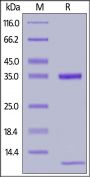 Cynomolgus / Rhesus macaque FCGRT&B2M Heterodimer Protein, His Tag, produced by co-expression of FCGRT and B2M, has a calculated MW of 34.1 kDa (FCGRT) and 11.6 kDa (B2M). Subunit FCGRT is fused with a polyhistidine tag at the C-terminus and subunit Beta-2 microglobulin (B2M) contains no tag at the C-terminus. The reducing (R) protein migrates as 34 kDa (FCGRT) and 12 kDa (B2M) respectively due to glycosylation.