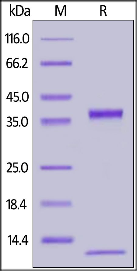 Biotinylated Cynomolgus / Rhesus macaque FcRn Heterodimer Protein, His, Avitag, produced by co-expression of FCGRT and B2M, has a calculated MW of 34.1 kDa (FCGRT) and 11.6 kDa (B2M). Subunit FCGRT is fused with a polyhistidine tag at the C-terminus , followed by an Avi tag (Avitag™) and subunit Beta-2 microglobulin (B2M) contains no tag at the C-terminus. The reducing (R) protein migrates as 35-40 kDa (FCGRT) and 13 kDa (B2M) respectively due to glycosylation.