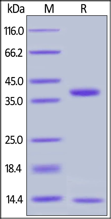 Biotinylated Human FCGRT&B2M Heterodimer Protein, Avitag, His Tag&Streptavidin II Tag, produced by co-expression of FCGRT and B2M, has a calculated MW of 34.1 kDa (FCGRT) and 13.1 kDa (B2M). Subunit FCGRT is fused with a polyhistidine tag at the C-terminus, followed by an Avi tag (Avitag™) and subunit Beta-2 microglobulin (B2M) is fused with Streptavidin II-tag at the C-terminus. The reducing (R) protein migrates as 38 kDa (FCGRT) and 14 kDa (B2M) respectively due to glycosylation.