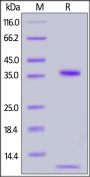 Biotinylated Human FCGRT&B2M Heterodimer Protein, His, Avitag, produced by co-expression of FCGRT and B2M, has a calculated MW of 34.2 kDa (FCGRT) and 11.7 kDa (B2M). Subunit FCGRT is fused with a polyhistidine tag at the C-terminus, followed by an Avi tag (Avitag™) and subunit Beta-2 microglobulin (B2M) contains no tag at the C-terminus. The reducing (R) protein migrates as 38-40 kDa (FCGRT) and 12 kDa (B2M) when calibrated against Star Ribbon Pre-stained Protein Marker respectively due to glycosylation.