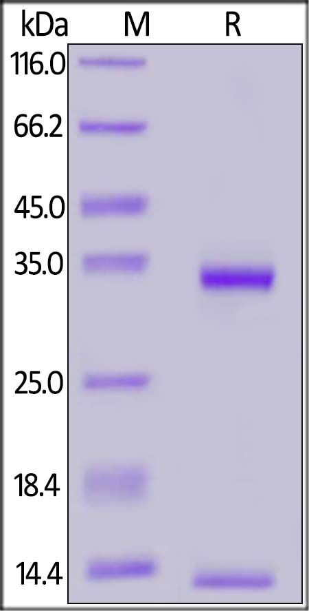 Porcine FCGRT&B2M Heterodimer Protein, His Tag&Streptavidin II Tag, produced by co-expression of FCGRT and B2M, has a calculated MW of 32.3 kDa (FCGRT) and 12.8 kDa (B2M). Subunit FCGRT is fused with a polyhistidine tag at the C-terminus and subunit Beta-2 microglobulin (B2M) is fused with a Streptavidin II tag at the C-terminus. The reducing (R) protein migrates as 32-35 kDa (FCGRT) and 14 kDa (B2M) respectively.