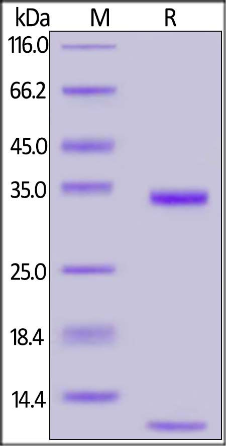 Rabbit FCGRT&B2M Heterodimer Protein, His Tag&Tag Free, produced by co-expression of FCGRT and B2M, has a calculated MW of 32.1 kDa (FCGRT) and 11.7 kDa (B2M). Subunit FCGRT is fused with a polyhistidine tag at the C-terminus and subunit Beta-2 microglobulin (B2M) contains no tag at the C-terminus. The reducing (R) protein migrates as 34 kDa (FCGRT) and 12 kDa (B2M) respectively due to glycosylation.