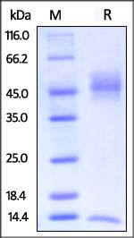 Biotinylated Rat FCGRT&B2M Heterodimer Protein, Avitag, His Tag&Streptavidin II Tag, produced by co-expression of FCGRT and B2M, has a calculated MW of 34.7 kDa (FCGRT) and 13.1 kDa (B2M). Subunit FCGRT is fused with an Avi tag (Avitag™) at the C-terminus, followed by a polyhistidine tag and subunit Beta-2 microglobulin (B2M) is fused with a Streptavidin II tag at the C-terminus. The reducing (R) protein migrates as 45-50 kDa (FCGRT) and 14 kDa (B2M) respectively due to different glycosylation.