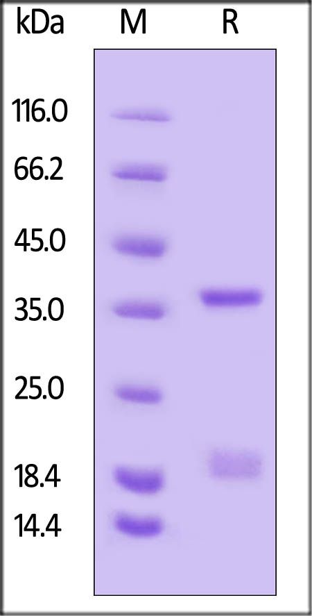 Biotinylated Feline FCGRT&B2M Heterodimer Protein, His, Avitag, produced by co-expression of FCGRT and B2M, has a calculated MW of 34.0 kDa (FCGRT) and 11.5 kDa (B2M). Subunit FCGRT is fused with a polyhistidine tag at the C-terminus, followed by an Avi tag (Avitag™) and subunit Beta-2 microglobulin (B2M) contains no tag. The reducing (R) protein migrates as 36-40 kDa (FCGRT) and 18-20 kDa (B2M) respectively due to glycosylation.