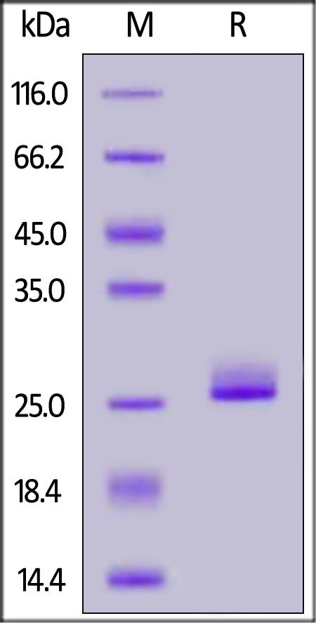 This protein carries a polyhistidine tag at the N-terminus. The protein has a calculated MW of 21.3 kDa. The protein migrates as 25-28 kDa under reducing (R) condition (SDS-PAGE) due to glycosylation.
