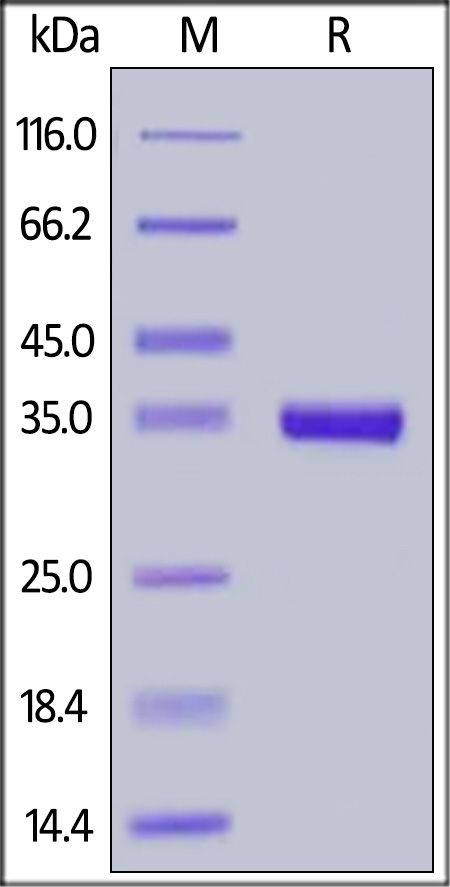 This protein carries a polyhistidine tag at the N-terminus. The protein has a calculated MW of 36.0 kDa. The protein migrates as 33-35 kDa under reducing (R) condition (SDS-PAGE) due to glycosylation.