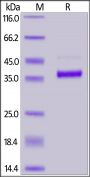 This protein carries a polyhistidine tag at the N-terminus, followed by an Avi tag (Avitag™). The protein has a calculated MW of 37.9 kDa. The protein migrates as 35-38 kDa under reducing (R) condition (SDS-PAGE) due to glycosylation.