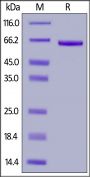 This protein carries an Avi tag (Avitag™) at the N-terminus, followed by a human IgG1 Fc tag. The protein has a calculated MW of 62.1 kDa. The protein migrates as 65 kDa under reducing (R) condition (SDS-PAGE) due to glycosylation.