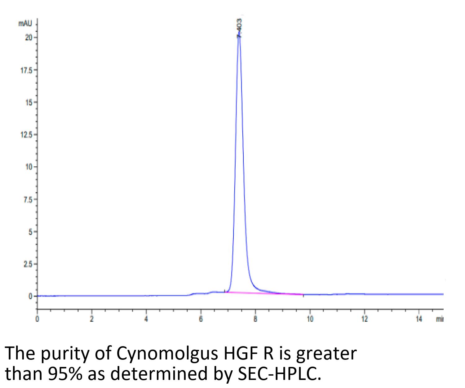 Recombinant Cynomolgus HGF R/c-MET Protein is expressed from HEK293 with His tag at the C-Terminus.It contains Glu25-Asn930.