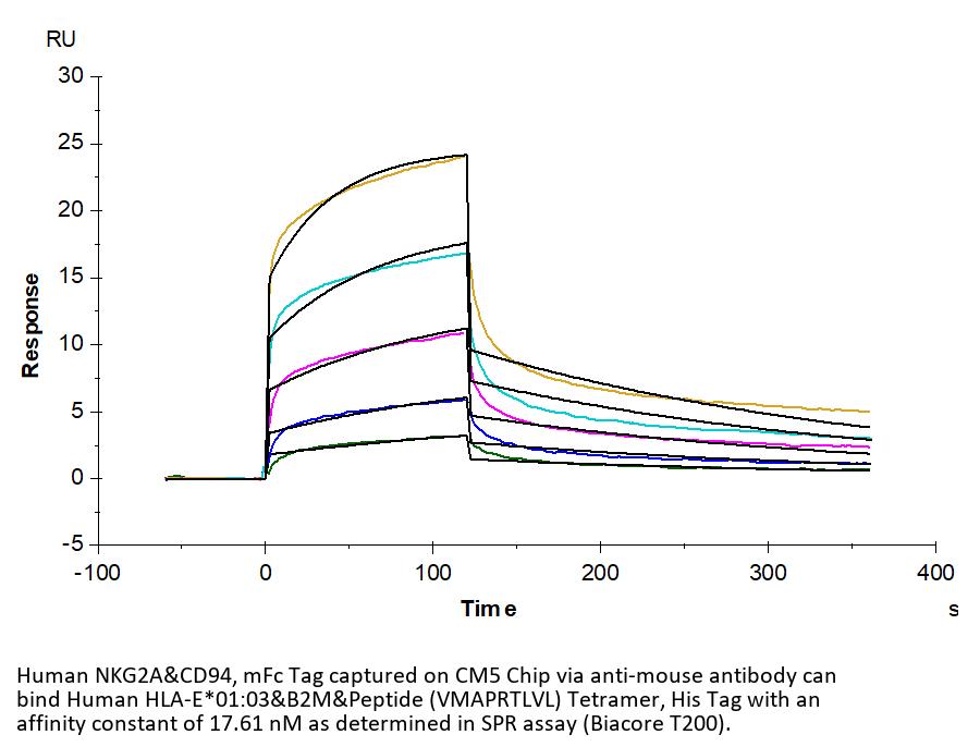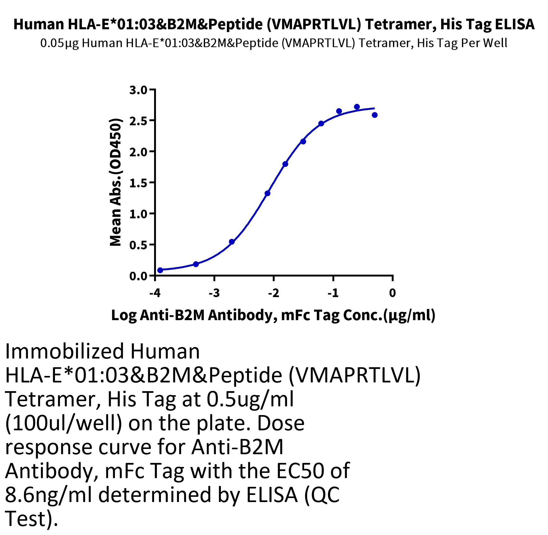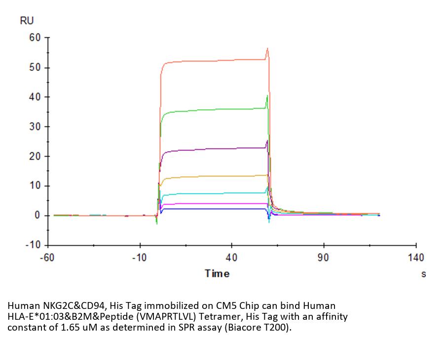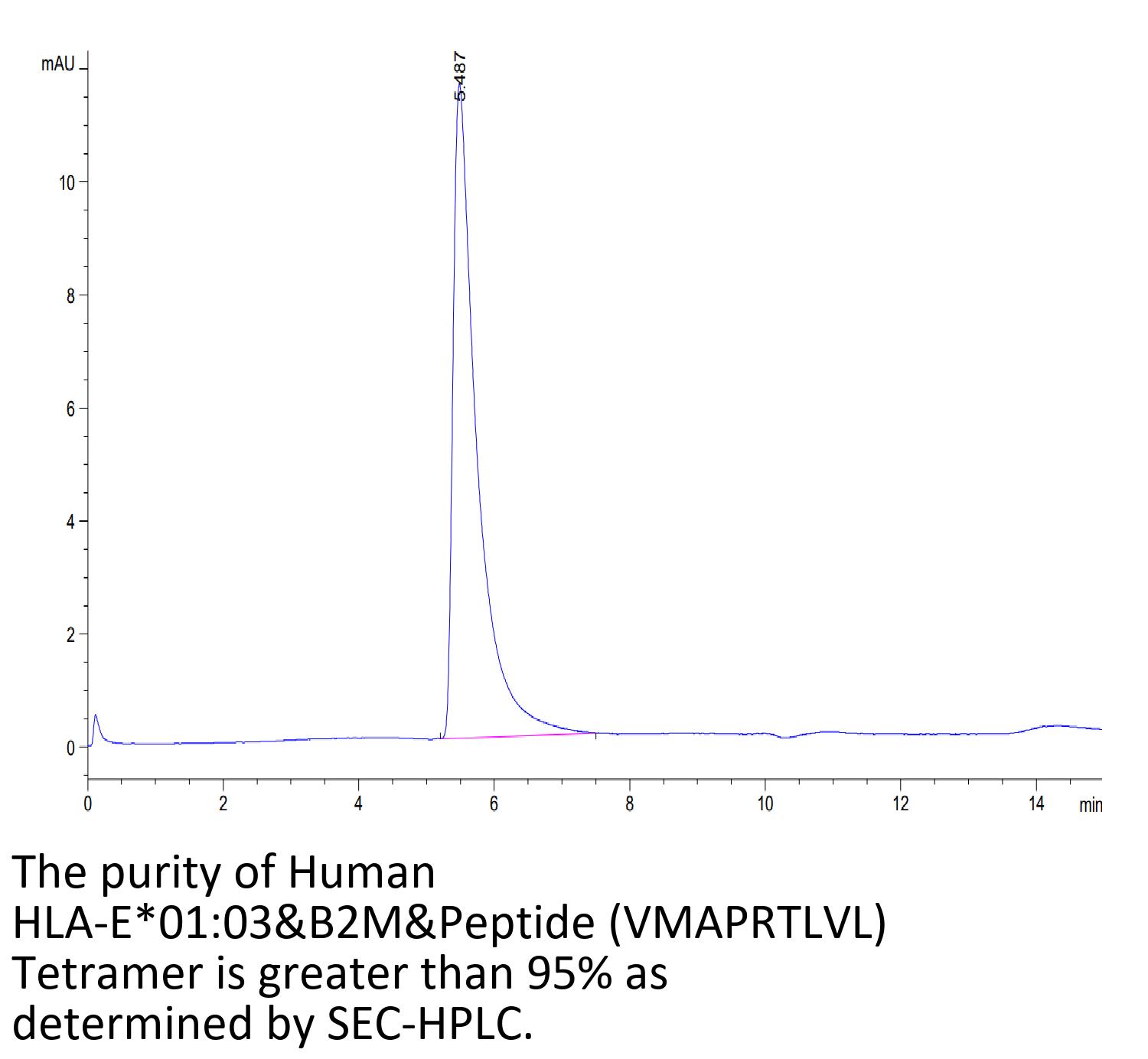 Recombinant Human HLA-E*01:03&B2M&Peptide (VMAPRTLVL) Tetramer Protein is expressed from HEK293 with His tag and Avi tag at the C-Terminus, tetramer is assembled by biotinylated monomer and streptavidin.It contains Gly22-Thr302(HLA-E*01:03), Ile21-Met119(B2M) and VMAPRTLVL peptide.