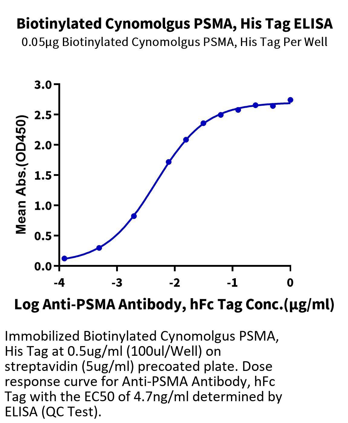 Recombinant Biotinylated Cynomolgus PSMA/FOLH1 Protein (Primary Amine Labeling) is expressed from HEK293 with His tag at the N-Terminus.It contains Lys44-Ala750.