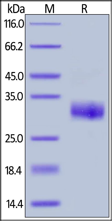 This protein carries a polyhistidine tag at the C-terminus. The protein has a calculated MW of 21.5 kDa. The protein migrates as 30-34 kDa under reducing (R) condition (SDS-PAGE) due to glycosylation.