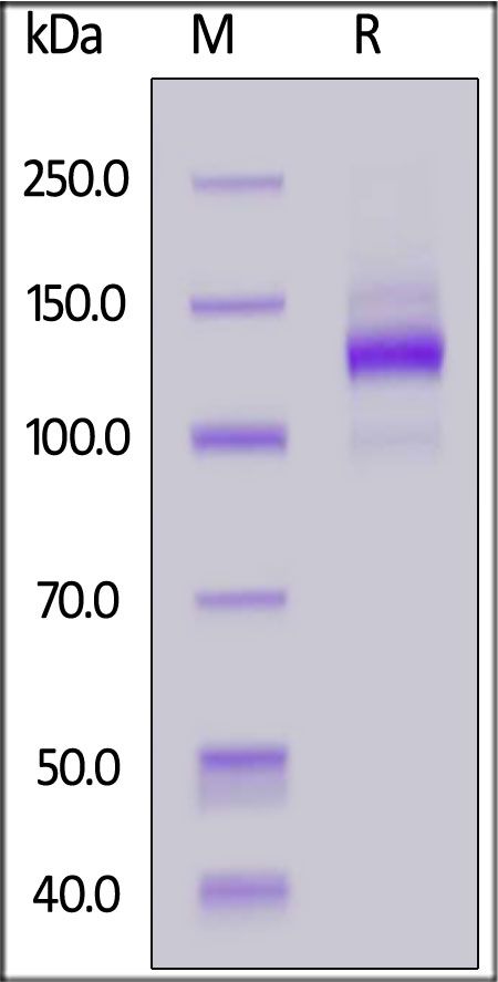 This protein carries a human IgG1 Fc tag at the C-terminus. The protein has a calculated MW of 107.6 kDa. The protein migrates as 125-140 kDa under reducing (R) condition (SDS-PAGE) due to glycosylation.