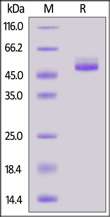 This protein carries a mouse IgG2a Fc tag at the C-terminus. The protein has a calculated MW of 40.2 kDa. The protein migrates as 45-50 kDa under reducing (R) condition (SDS-PAGE) due to glycosylation.