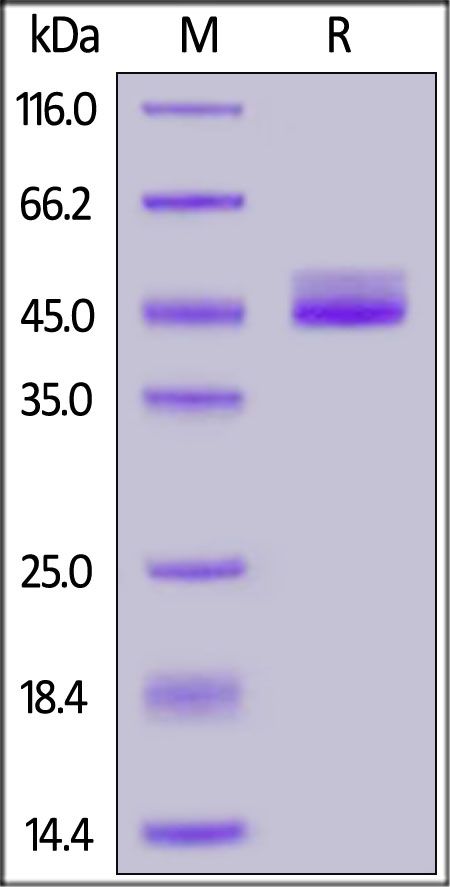This protein carries a human IgG1 Fc tag at the C-terminus. The protein has a calculated MW of 39.9 kDa. The protein migrates as 45-55 kDa under reducing (R) condition (SDS-PAGE) due to glycosylation.