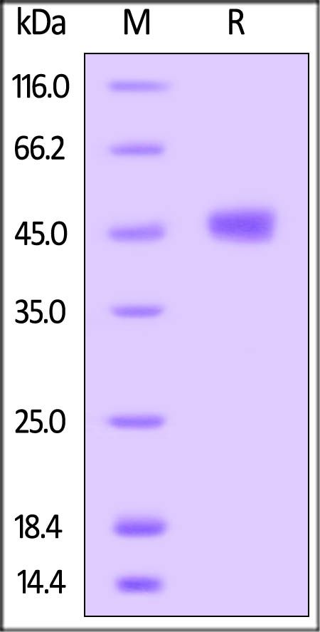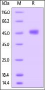 This protein carries a mouse IgG2a Fc tag at the C-terminus. The protein has a calculated MW of 40.1 kDa. The protein migrates as 45-50 kDa under reducing (R) condition (SDS-PAGE) due to glycosylation.