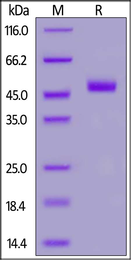 This protein carries a human IgG1 Fc tag at the C-terminus. The protein has a calculated MW of 39.7 kDa. The protein migrates as 45-54 kDa under reducing (R) condition (SDS-PAGE) due to glycosylation.