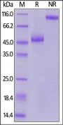 This protein carries a human IgG1 Fc tag at the C-terminus, followed by an Avi tag (Avitag™). The protein has a calculated MW of 41.3 kDa. The protein migrates as 45-55 kDa under reducing (R) condition, and 85-115 kDa under non-reducing (NR) condition (SDS-PAGE) due to glycosylation.