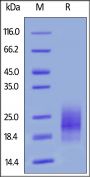 This protein carries a polyhistidine tag at the C-terminus. The protein has a calculated MW of 14.8 kDa. The protein migrates as 18-30 kDa under reducing (R) condition (SDS-PAGE) due to glycosylation.