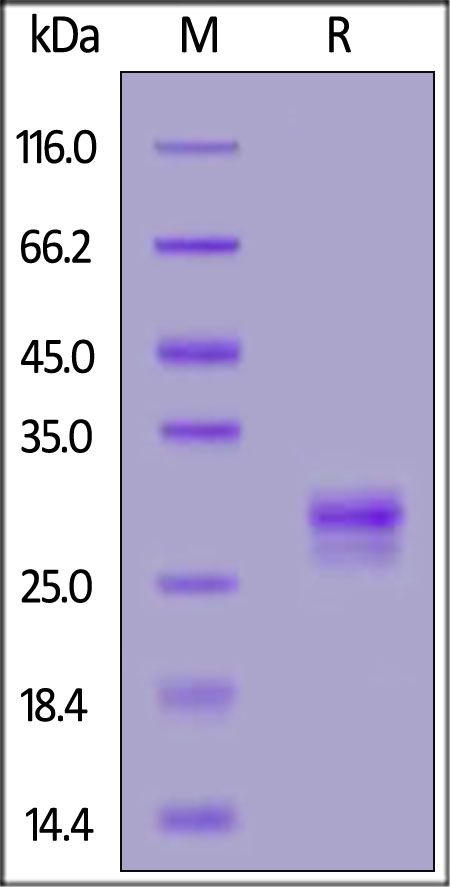 This protein carries a polyhistidine tag at the N-terminus. The protein has a calculated MW of 22.4 kDa. The protein migrates as 26 kDa and 28-30 kDa when calibrated against Star Ribbon Pre-stained Protein Marker under reducing (R) condition (SDS-PAGE) due to glycosylation.