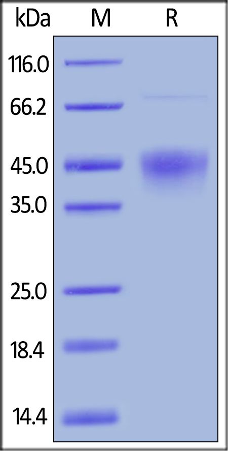 This protein carries an Avi tag (Avitag™) at the C-terminus, followed by a polyhistidine tag. The protein has a calculated MW of 23.1 kDa. The protein migrates as 40-50 kDa under reducing (R) condition (SDS-PAGE) due to glycosylation.