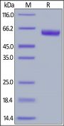 This protein carries a human IgG1 Fc tag at the C-terminus. The protein has a calculated MW of 47.9 kDa. The protein migrates as 55-60 kDa when calibrated against Star Ribbon Pre-stained Protein Marker under reducing (R) condition (SDS-PAGE) due to different glycosylation.