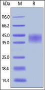 This protein carries a polyhistidine tag at the C-terminus. The protein has a calculated MW of 26.0 kDa. The protein migrates as 35-45 kDa when calibrated against Star Ribbon Pre-stained Protein Marker under reducing (R) condition (SDS-PAGE) due to glycosylation.