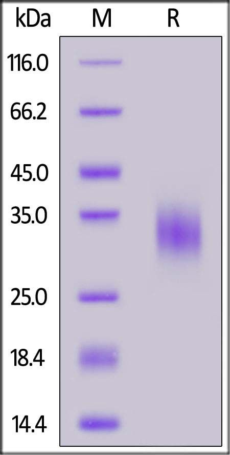 This protein carries a polyhistidine tag at the C-terminus. The protein has a calculated MW of 20.9 kDa. The protein migrates as 30-37 kDa when calibrated against Star Ribbon Pre-stained Protein Marker under reducing (R) condition (SDS-PAGE) due to glycosylation.