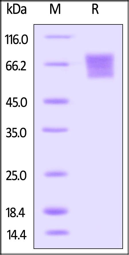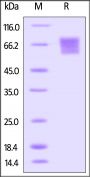 This protein carries a human IgG1 Fc tag at the C-terminus, followed by an Avi tag (Avitag™). The protein has a calculated MW of 47.7 kDa. The protein migrates as 55-70 kDa under reducing (R) condition (SDS-PAGE) due to glycosylation.