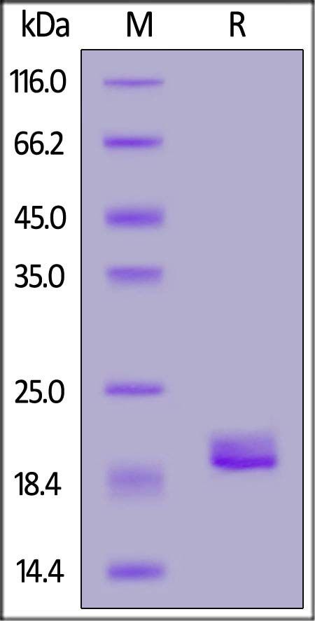 This protein carries a polyhistidine tag at the C-terminus. The protein has a calculated MW of 18.6 kDa. The protein migrates as 19-22 kDa under reducing (R) condition (SDS-PAGE) due to glycosylation.