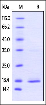 This protein carries a polyhistidine tag at the C-terminus. The protein has a calculated MW of 18.3 kDa. The protein migrates as 17-19 kDa when calibrated against Star Ribbon Pre-stained Protein Marker under reducing (R) condition (SDS-PAGE) due to glycosylation.
