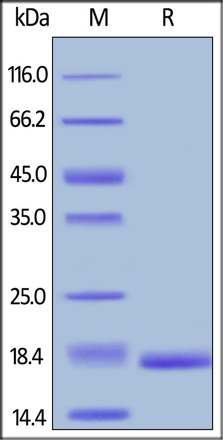 The product does NOT contain any epitope tags. The protein has a calculated MW of 17.4 kDa. The protein migrates as 16-17 kDa when calibrated against Star Ribbon Pre-stained Protein Marker under reducing (R) condition (SDS-PAGE) due to glycosylation.