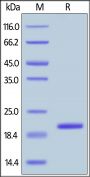 This protein carries a polyhistidine tag at the C-terminus, followed by an Avi tag (Avitag™). The protein has a calculated MW of 20.0 kDa. The protein migrates as 21 kDa when calibrated against Star Ribbon Pre-stained Protein Marker under reducing (R) condition (SDS-PAGE) due to glycosylation.