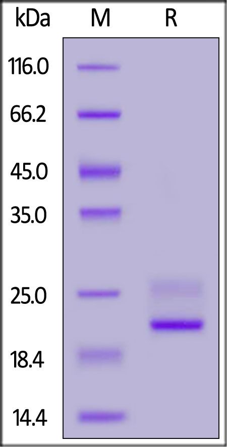 This protein carries a polyhistidine tag at the C-terminus, followed by an Avi tag (Avitag™). The protein has a calculated MW of 20.2 kDa. The protein migrates as 20-21 kDa under reducing (R) condition (SDS-PAGE) due to glycosylation.