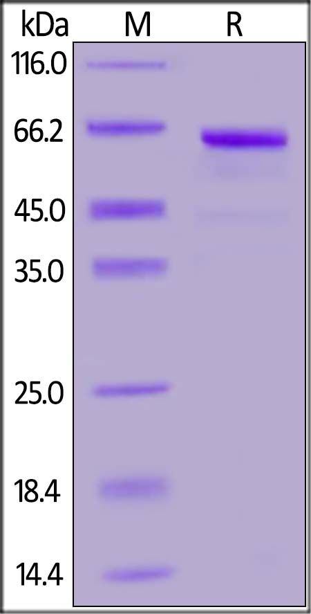This protein carries a human IgG1 Fc tag at the C-terminus. The protein has a calculated MW of 56.2 kDa. The protein migrates as 60-65 kDa when calibrated against Star Ribbon Pre-stained Protein Marker under reducing (R) condition (SDS-PAGE) due to glycosylation.