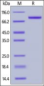 This protein carries a human IgG1 Fc tag at the C-terminus. The protein has a calculated MW of 70.2 kDa. The protein migrates as 90 kDa under reducing (R) condition (SDS-PAGE) due to glycosylation.