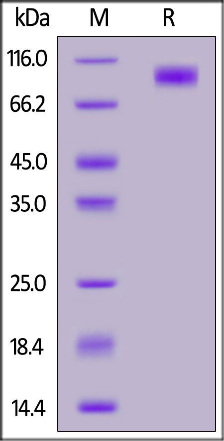 This protein carries a human IgG1 Fc tag at the C-terminus. The protein has a calculated MW of 61.8 kDa. The protein migrates as 80-115 kDa under reducing (R) condition (SDS-PAGE) due to glycosylation.