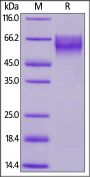 This protein carries a polyhistidine tag at the C-terminus, followed by an Avi tag (Avitag™). The protein has a calculated MW of 39.0 kDa. The protein migrates as 50-70 kDa under reducing (R) condition (SDS-PAGE) due to glycosylation.