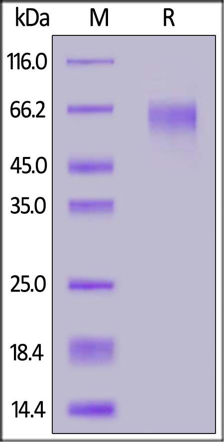 This protein carries a polyhistidine tag at the C-terminus. The protein has a calculated MW of 37.7 kDa. The protein migrates as 55-65 kDa under reducing (R) condition (SDS-PAGE) due to glycosylation.