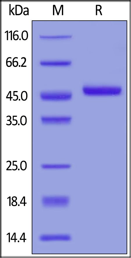 This protein carries a human IgG1 Fc tag at the C-terminus. The protein has a calculated MW of 49.0 kDa. The protein migrates as 45-50 kDa under reducing (R) condition (SDS-PAGE) due to glycosylation.