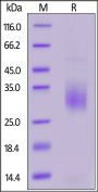 This protein carries a polyhistidine tag at the C-terminus. The protein has a calculated MW of 19.3 kDa. The protein migrates as 30-40 kDa under reducing (R) condition (SDS-PAGE) due to glycosylation.
