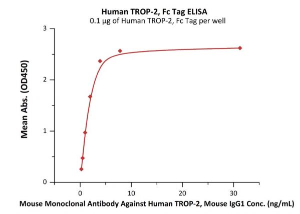 TROP-2 is a single-copy gene in human cells, and encodes a type-1 transmembrane glycoprotein which is over-expressed in various malignancies, also referred to as tumor associated calcium signal transducer 2 (TACSTD2), GA733-1 or M1S1. TROP-2 is related to epithelial cell adhesion molecule (EpCAM), also called TROP-1, gp40, and KSA. Trop-1 and Trop-2 are homologous to serum IGF-II-binding proteins and appear as signal transducers. Thus, they likely represent novel cell-surface receptors and may play a role in regulating the growth of carcinoma cells.