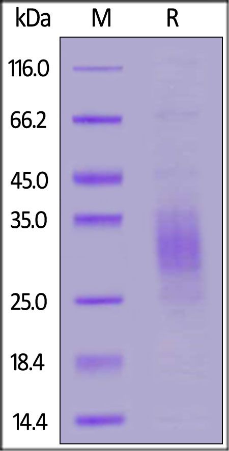 This protein carries a polyhistidine tag at the C-terminus, followed by an Avi tag (Avitag™). The protein has a calculated MW of 21.0 kDa. The protein migrates as 29-40 kDa when calibrated against Star Ribbon Pre-stained Protein Marker under reducing (R) condition (SDS-PAGE) due to glycosylation.