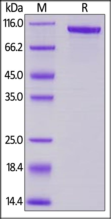 This protein carries a mouse IgG2a Fc tag at the C-terminus. The protein has a calculated MW of 101.8 kDa. The protein migrates as 100 kDa when calibrated against Star Ribbon Pre-stained Protein Marker under reducing (R) condition (SDS-PAGE) due to glycosylation.